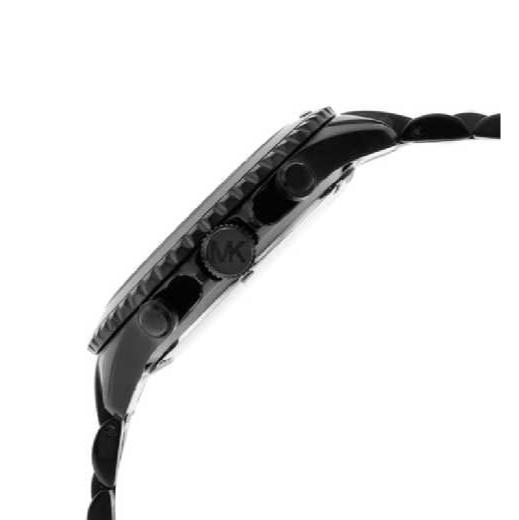 Solid case back. Round case shape. Case size: 44 mm. Case thickness: 11 mm. Band width: 22 mm. Fold over clasp with a push button release. Water resistant at 50 meters / 165 feet. Functions: chronograph, date, hour, minute, second. Bayville Series. Casual watch style. Michael Kors Bayville Chronograph Quartz Black Dial Watch MK8750.