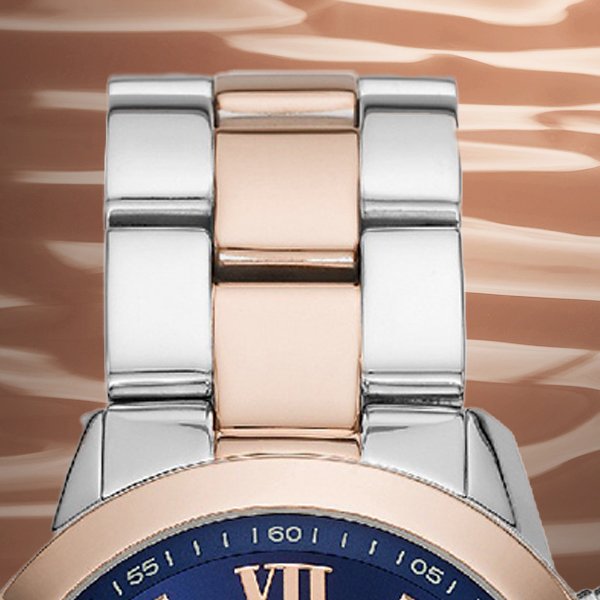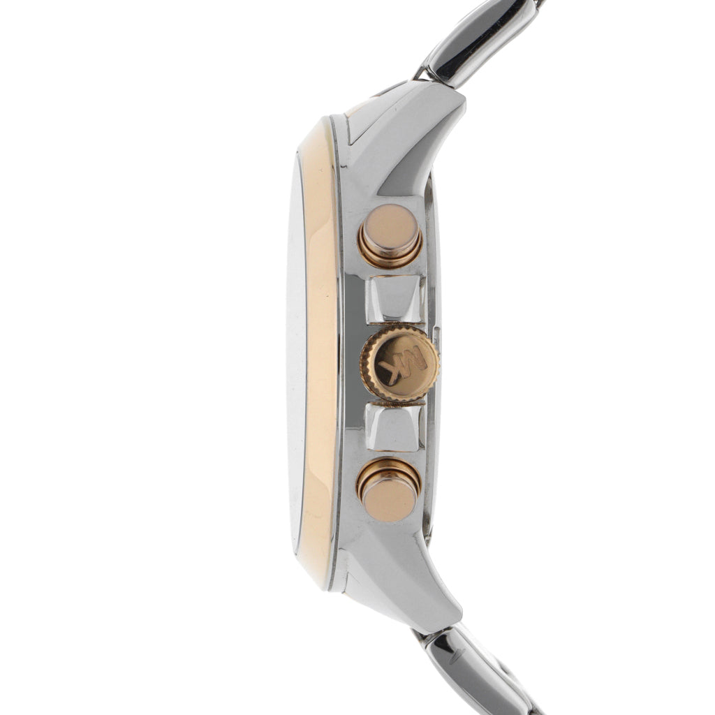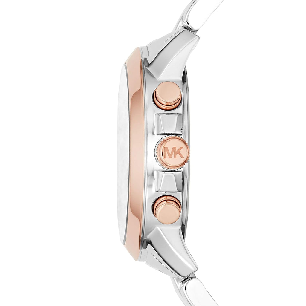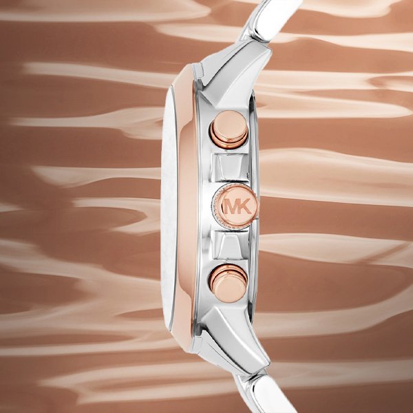 This Michael Kors Bradshaw watch exudes jet-set style with a mixed metal tones, rose gold-tone and silver tone bracelet. A blue sunray dial completes the look.