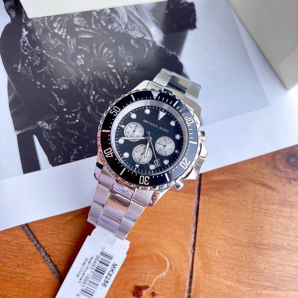 Scratch resistant mineral crystal. Solid case back. Case diameter: 45 mm. Case thickness: 14 mm. Round case shape. Band width: 24 mm. Deployment clasp. Water resistant at 100 meters / 330 feet. Functions: chronograph, date, hour, minute, second. Casual watch style. Michael Kors Everest Chronograph Black Dial Stainless Steel Mens Watch MK8256.