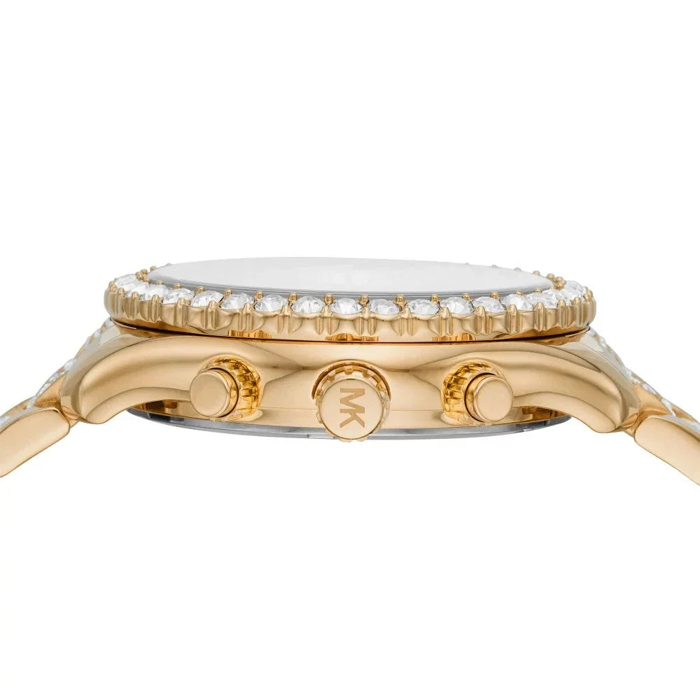Michael Kors' 42mm Layton watch features a gold-tone stingray pavé dial, gold-tone case with oversized glitz topring, chronograph movement and gold-tone stainless steel bracelet with stingray pavé center links.
