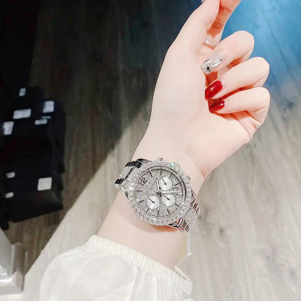 Michael Kors' 42mm Layton watch features a silver stingray pavé dial, silver case with oversized glitz topring, chronograph movement and stainless steel bracelet with stingray pavé center links.