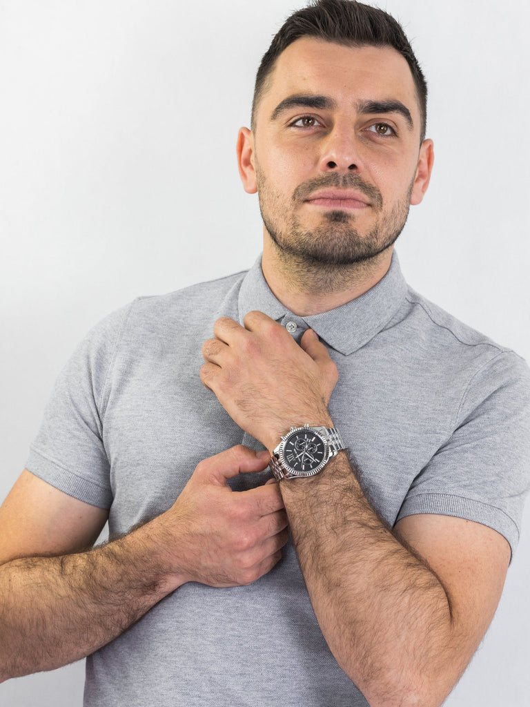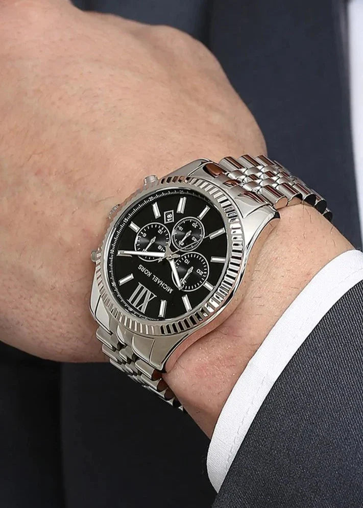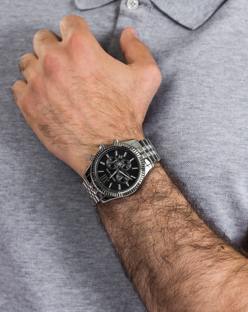 A handsome men's model, part of the Lexington collection - refined, modern and stylish. Stainless steel case and chain, black chronograph display with date indicator and mineral glass. Diameter 44 mm, thickness 13 mm, chain width 22 mm. Water resistance: 10 ATM - allows getting wet, bathing and swimming in pools of water.