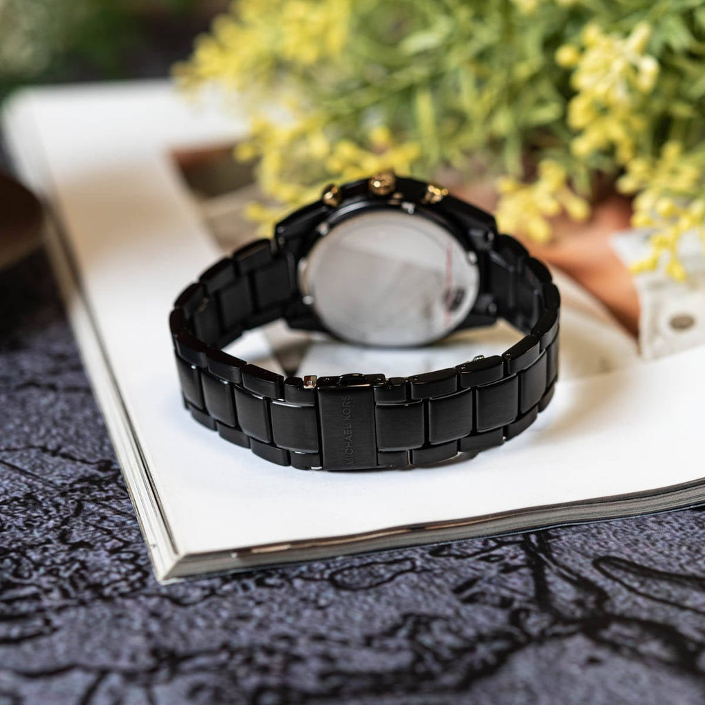 This fall, Michael Kors newest men's platform has arrived. This ACCELERATOR watch features a 42mm diameter case with a chronograph movement. Black dial combined with a stainless steel bracelet.