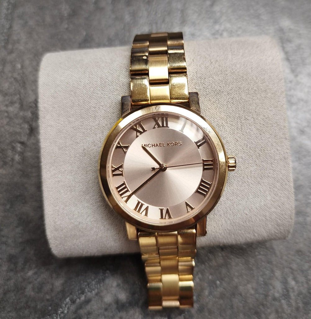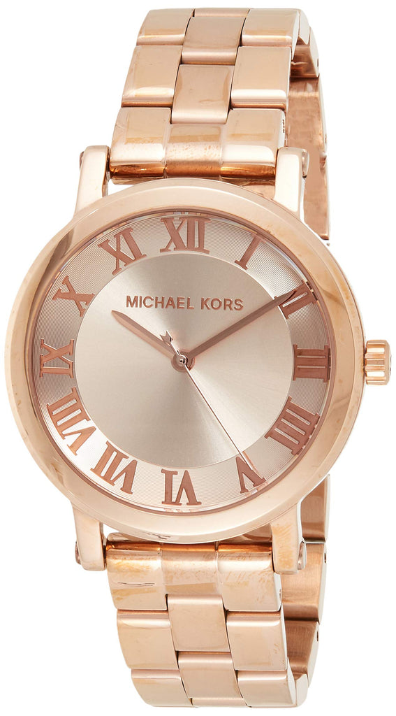 New for fall, the Michael Kors Norie watch effortlessly pairs a classic rose gold-tone three-link bracelet and case with a modern sunray dial. The etched index ring is set with Roman numerals for added style.
