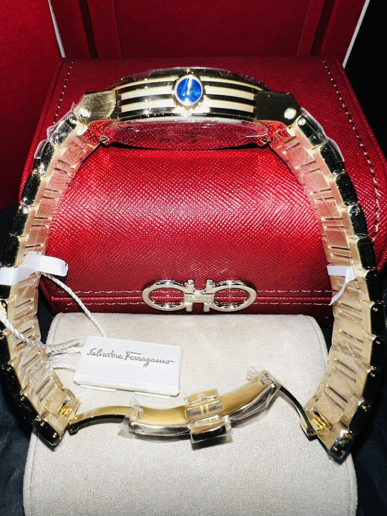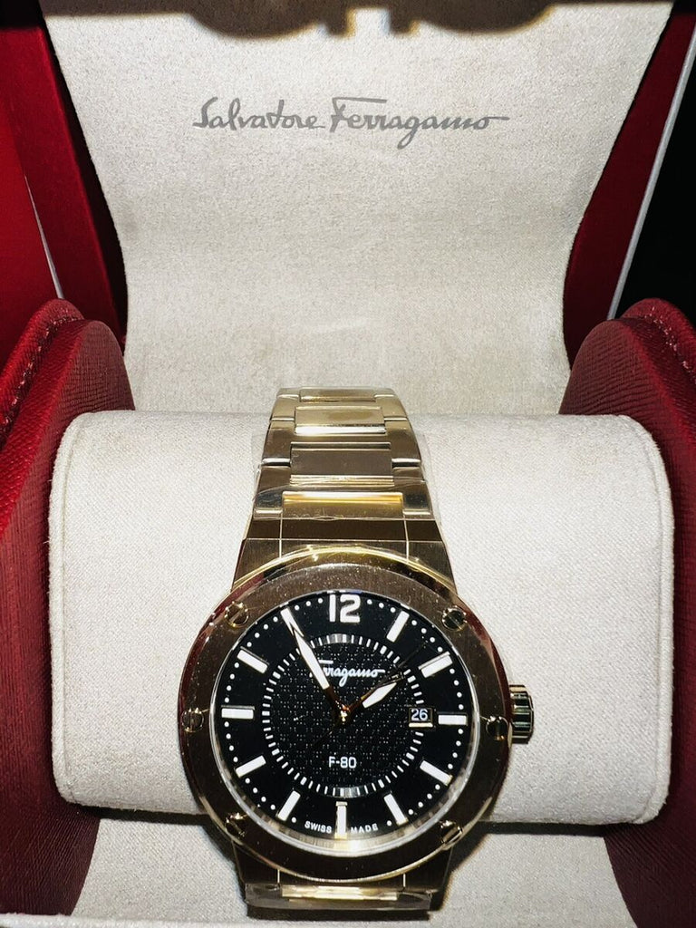 The Salvatore Ferragamo F-80 Classic Watch exudes timeless elegance with its black dial and gold steel strap. With its precision Swiss quartz movement, this watch provides accurate timekeeping. Featuring a water resistance of 100 meters, it is perfect for everyday wear. Elevate your style with this sophisticated timepiece.