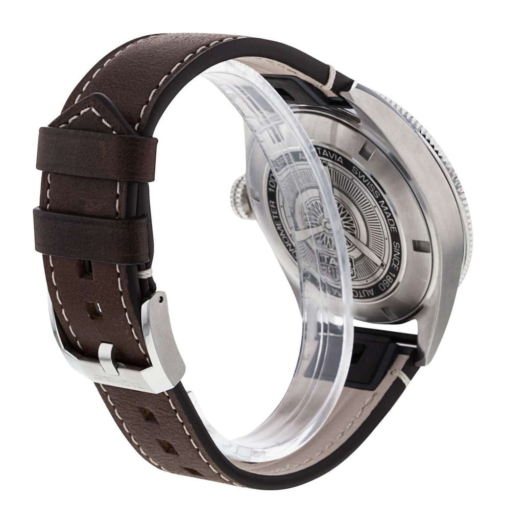Protected by a domed and beveled sapphire crystal with double anti-reflective treatment, the Autavia’s stainless-steel case has brushed and polished lugs and is water resistant to 100 meters.