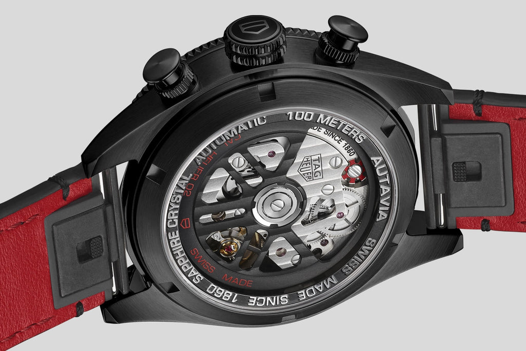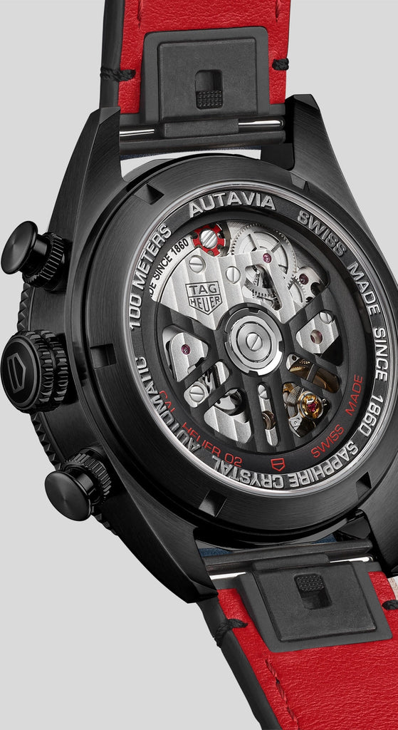 The 42mm black DLC polished, fine brushed case echoes the classic Autavia heritage. Water resistance to 100 meters thanks to a screw-in crown. Crafted for heroic adventure-seekers.