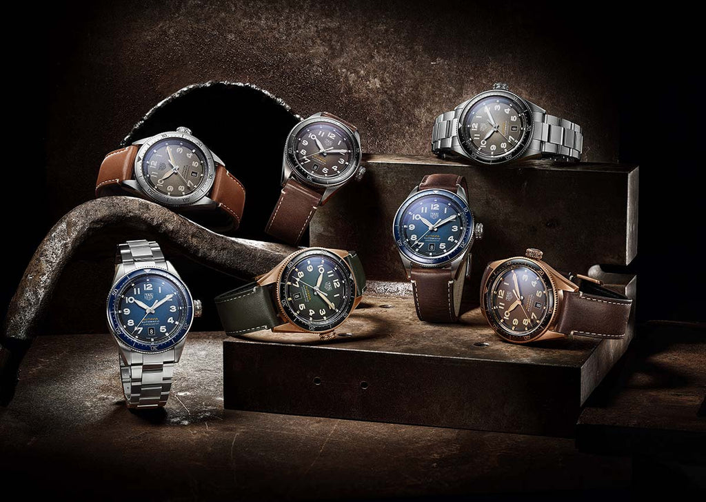 The oversized crown, Arabic numerals and sword-shaped hands take inspiration from Heuer pilot watches and timers from 1933 to 1957. The dial is smoked brown, the ceramic 60-minute bezel rotates bi-directionally. The rounded stainless-steel case and beveled lugs echo those of the Autavia from the 1960s.