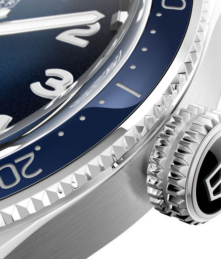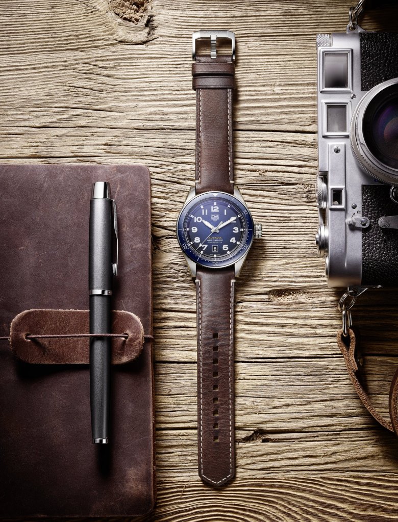 Retro flair, aviation-grade technology: the brown calfskin strap echoes those on Heuer pilot watches from the mid-century; the bidirectional turning bezel, however, is made from very advanced material-science ceramic.