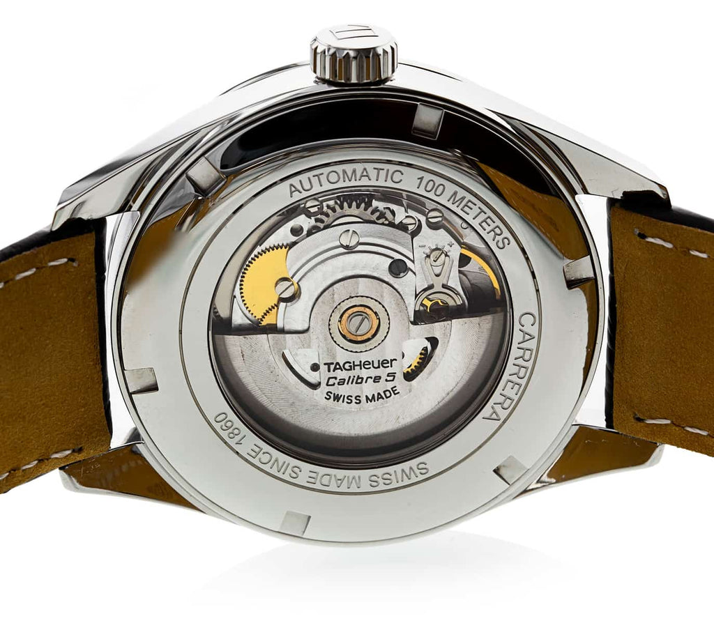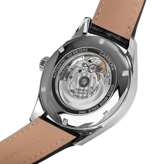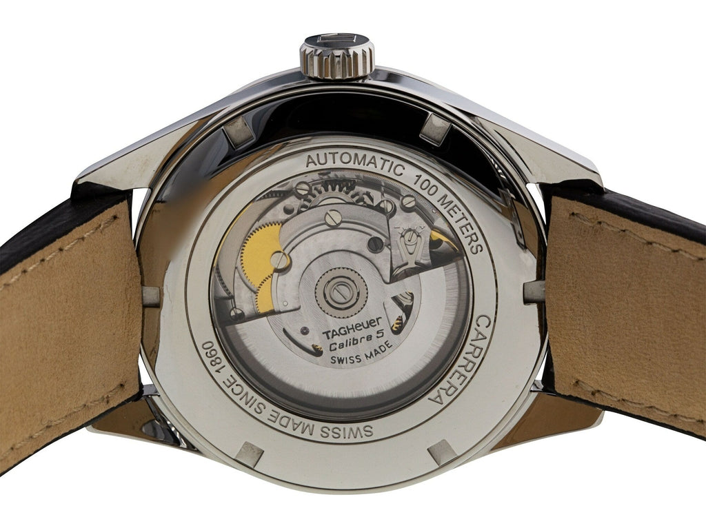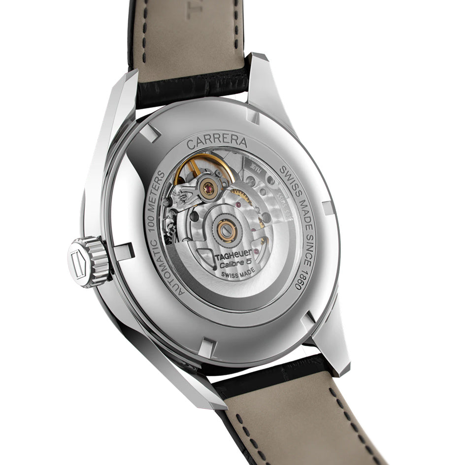 The polished 41mm steel case is matched with a polished steel fixed bezel and a polished steel crown engraved with the TAG Heuer logo. The crystal and case back are in sapphire. Water resistance is to 100 meters.