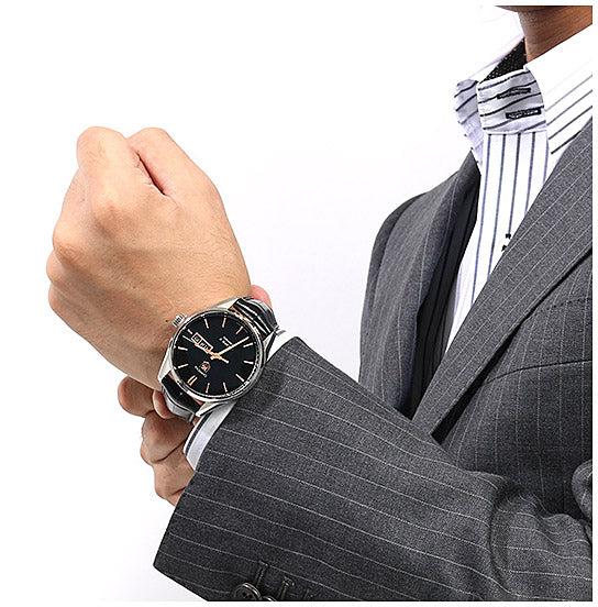 Rose-gold elements, including a day-date aperture, on a black dial with a matching black alligator strap. Designed for men with urban, on-the-go lifestyles.
