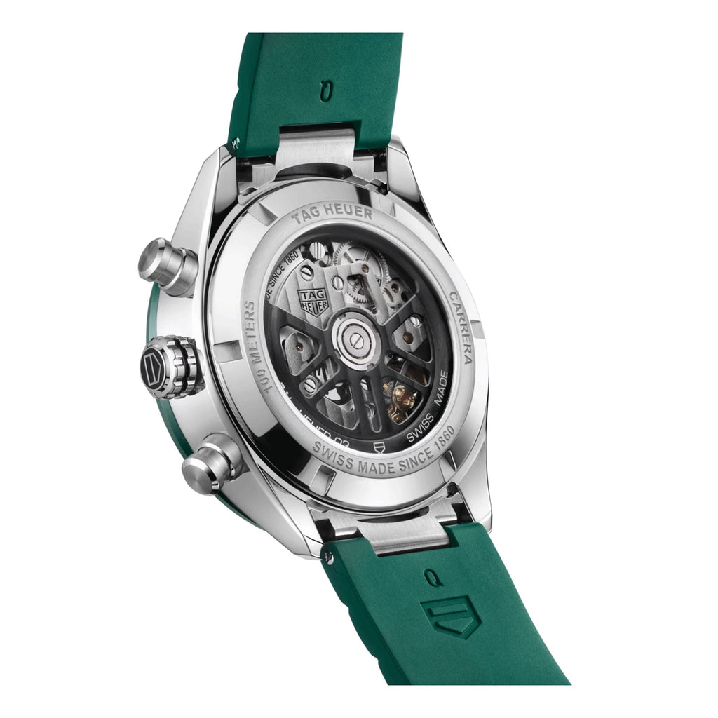 Intense, captivating shades of green pervade this modern take on the TAG Heuer Carrera. Showcasing sporty lugs and superb finishings, it proudly distills its bold elegance. Equipped with the indomitable Calibre Heuer 02 and ready to roar ahead.