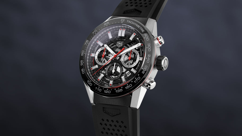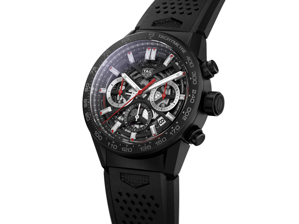 A black ceramic tachymeter chronograph, equipped with the new Manufacture Heuer 02 automatic movement, who has a stunning 80 hours power reserve. The black skeleton dial is matched with a racing-inspired strap in perforated rubber.