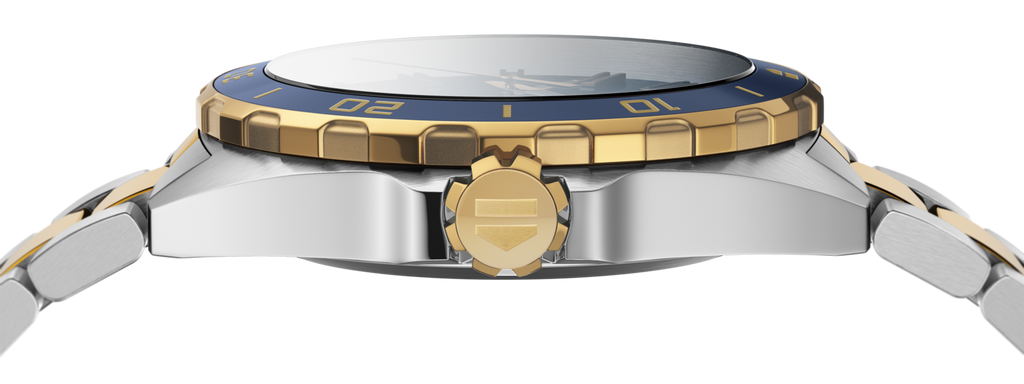 Stainless steel case with a two-tone (silver-tone and yellow gold-plated) stainless steel bracelet. Unidirectional rotating yellow gold-plated stainless steel with a blue top ring bezel. Navy blue dial with luminous yellow gold-tone hands and index hour markers. Arabic numerals mark the 6 and 12 o’clock positions. minute markers around the outer rim. Dial Type: Analog. Luminescent hands and markers.