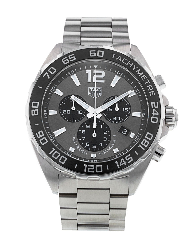 TAG HEUER Formula 1 Gent’s Watch has a Silver-tone stainless steel case with a silver-tone stainless steel bracelet. Fixed silver-tone stainless steel with a black ceramic inlay showing tachymeter markings bezel. Anthracite dial with luminous silver-tone hands and index hour markers.