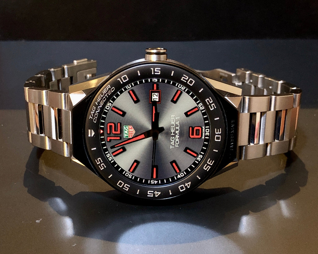 Grey, black and red, with angled date and TAG Heuer logo: the easy-read dial, inspired by the crucial requisites of race-car cockpit design, is eye-catching and energetic.