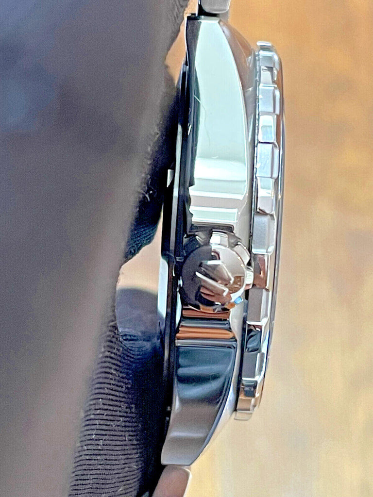 - 43mm brushed steel case with black ceramic tachymeter bezel