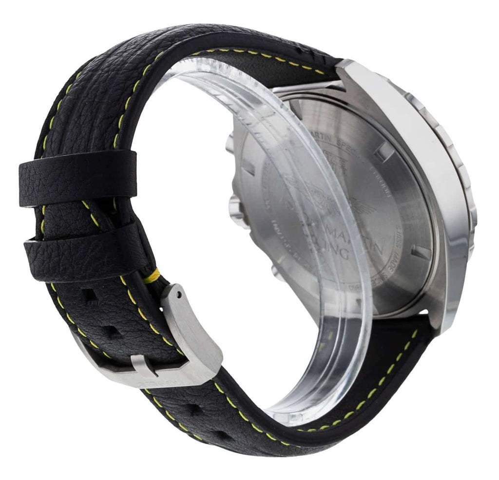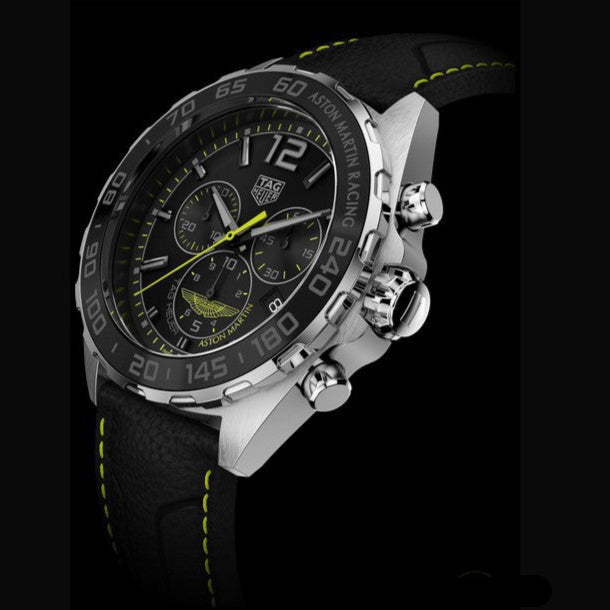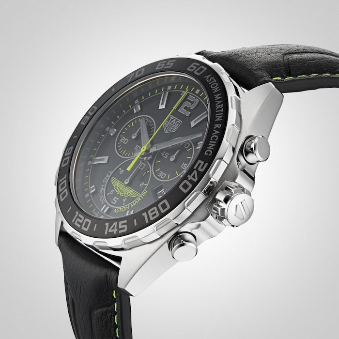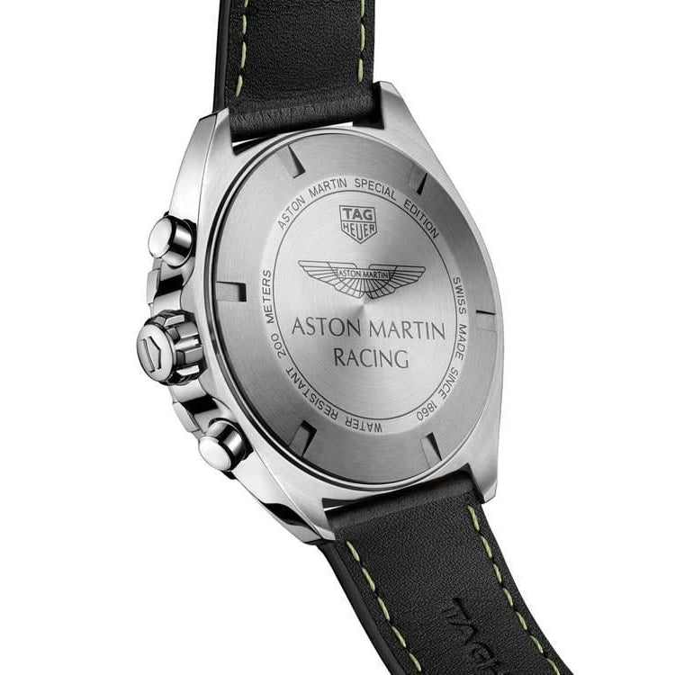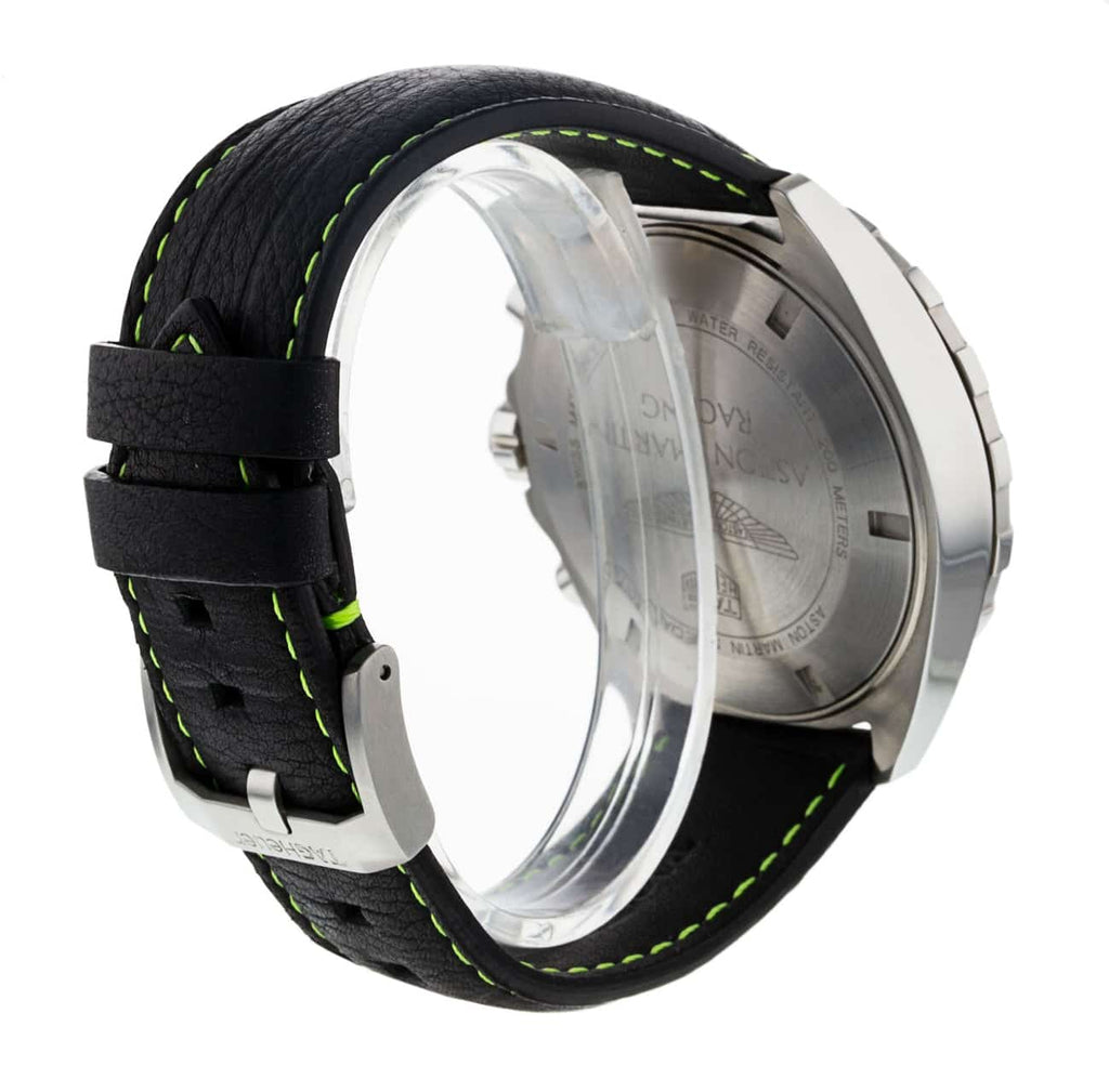 The indexes, seconds hand and Aston Martin's famous winged logo are in the racing team’s signature lime green, sharply contrasted with the all-black dial. The magnificent black leather strap topstitched in the racing legend’s iconic shade of lime green.