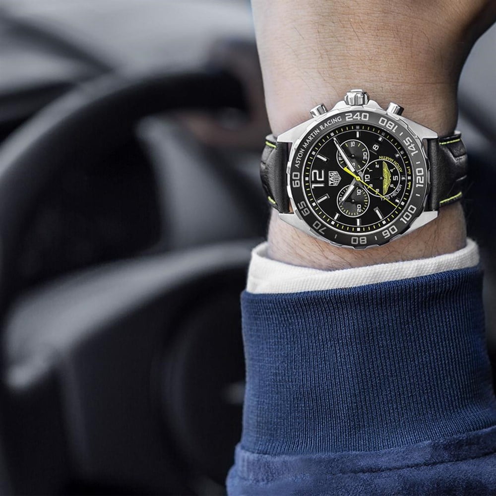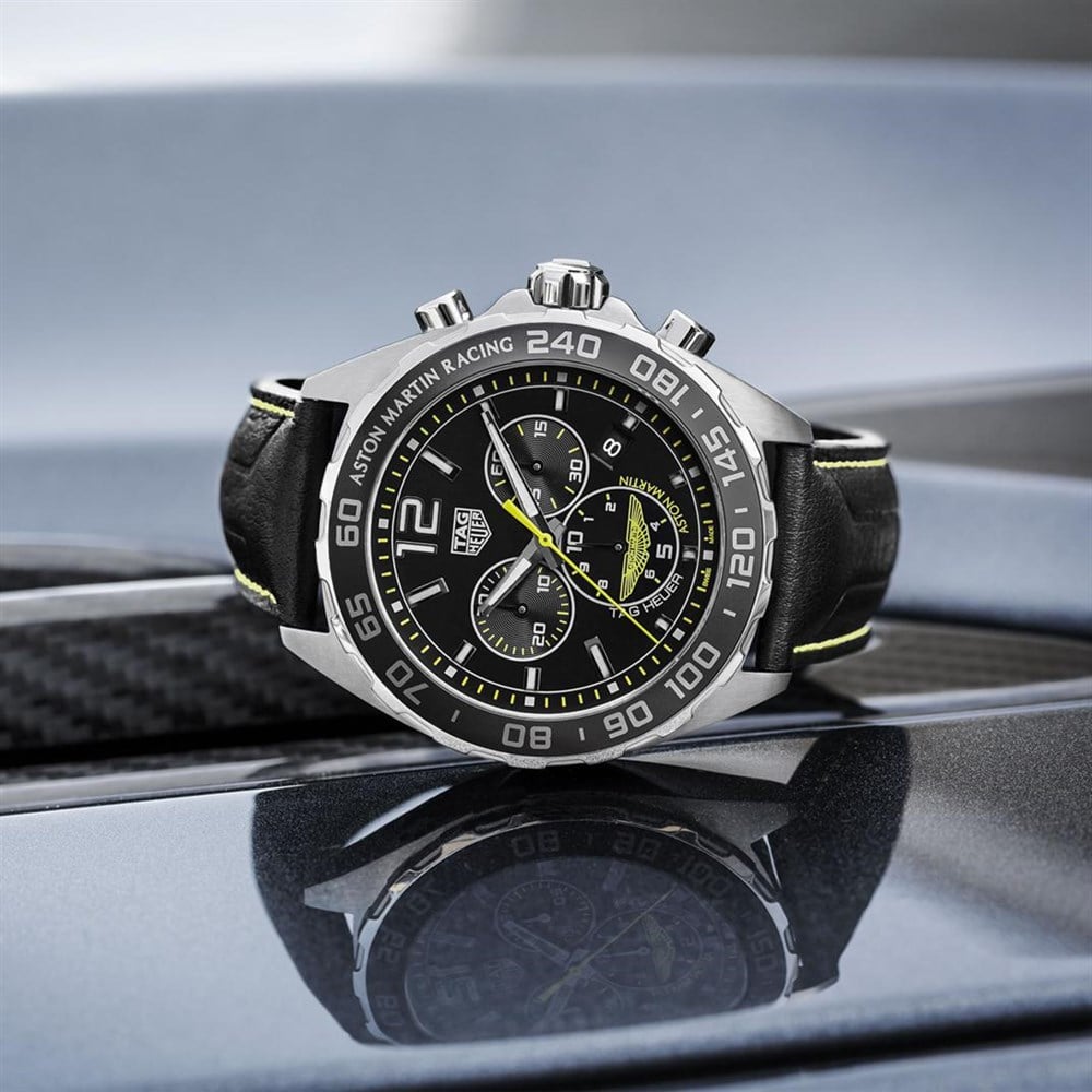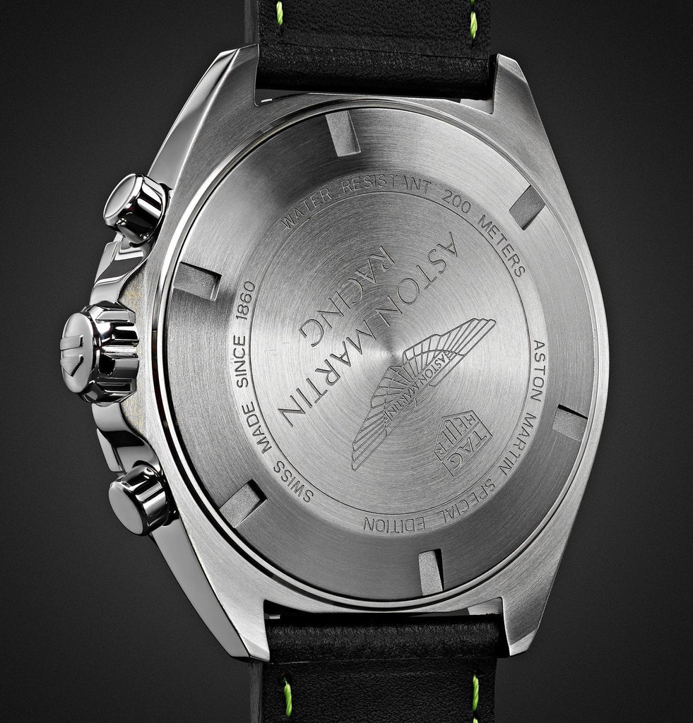 The indexes, seconds hand and Aston Martin's famous winged logo are in the racing team’s signature lime green, sharply contrasted with the all-black dial. The magnificent black leather strap topstitched in the racing legend’s iconic shade of lime green.
