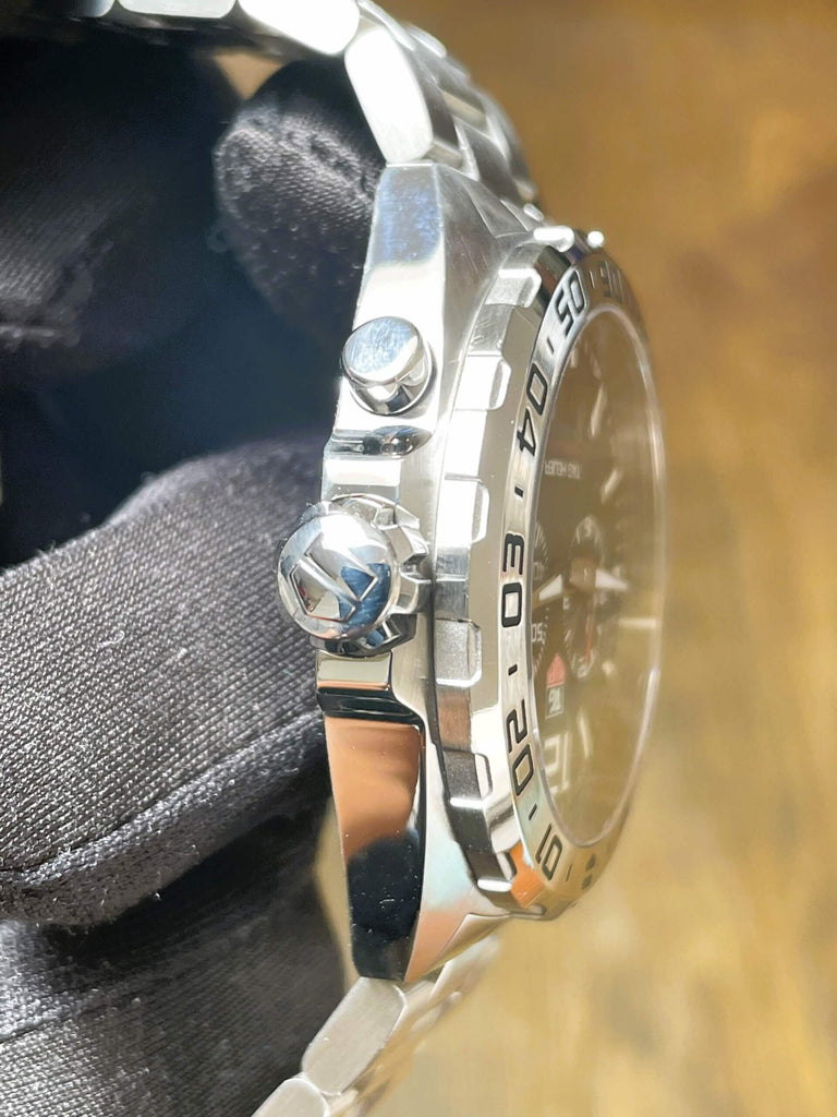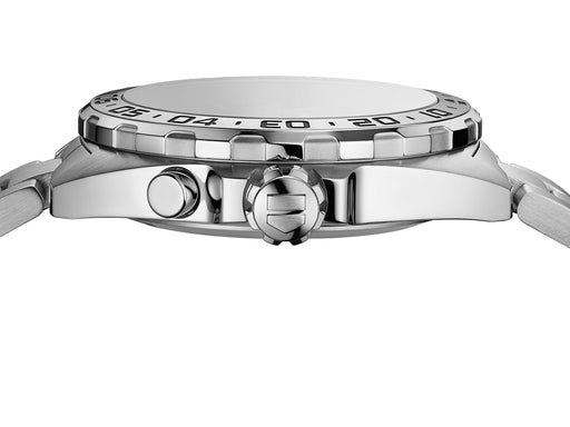 - Polished steel Easy Grip screw-in crown with raised fine-brushed TAG Heuer shield
