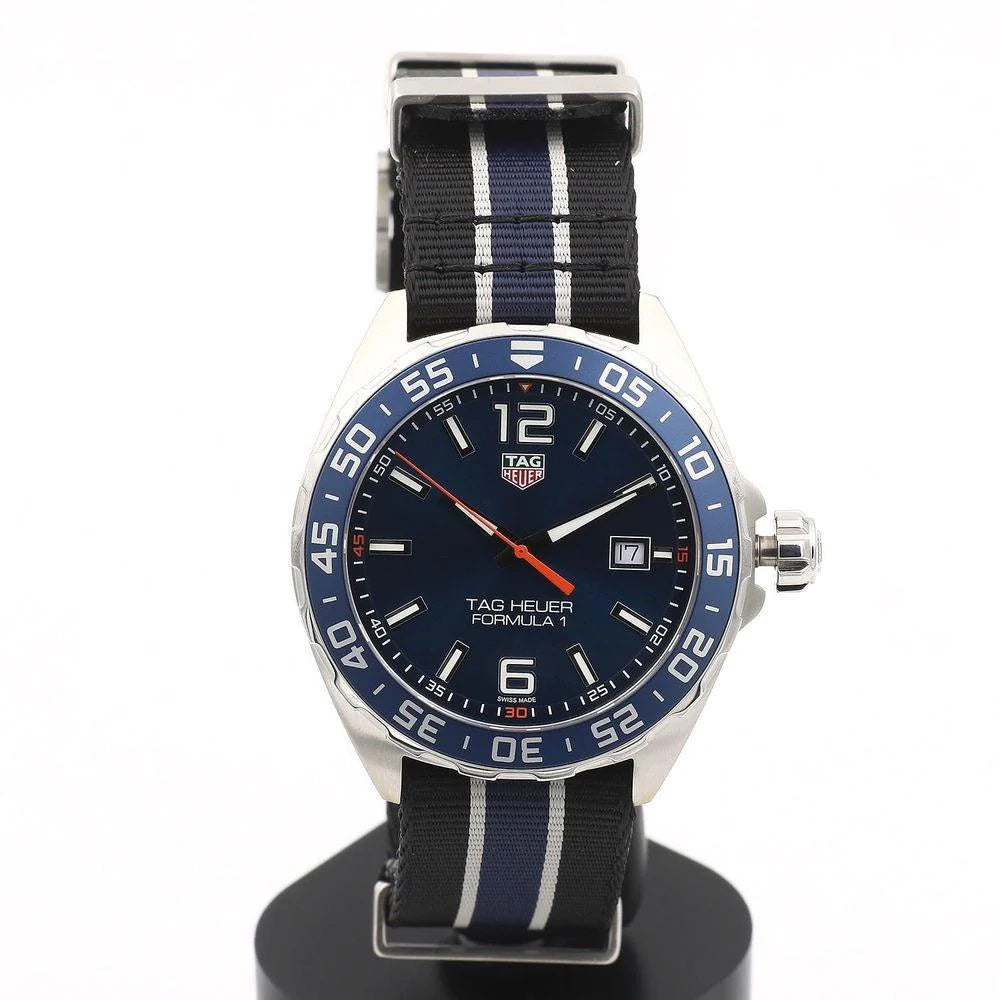 The Tag Heuer Formula 1 is a casual sports watch for a high paced life. Complete with a Quartz Chronograph, Blue bezel and a NATO strap, this watch will be able to handle anything you throw at it.