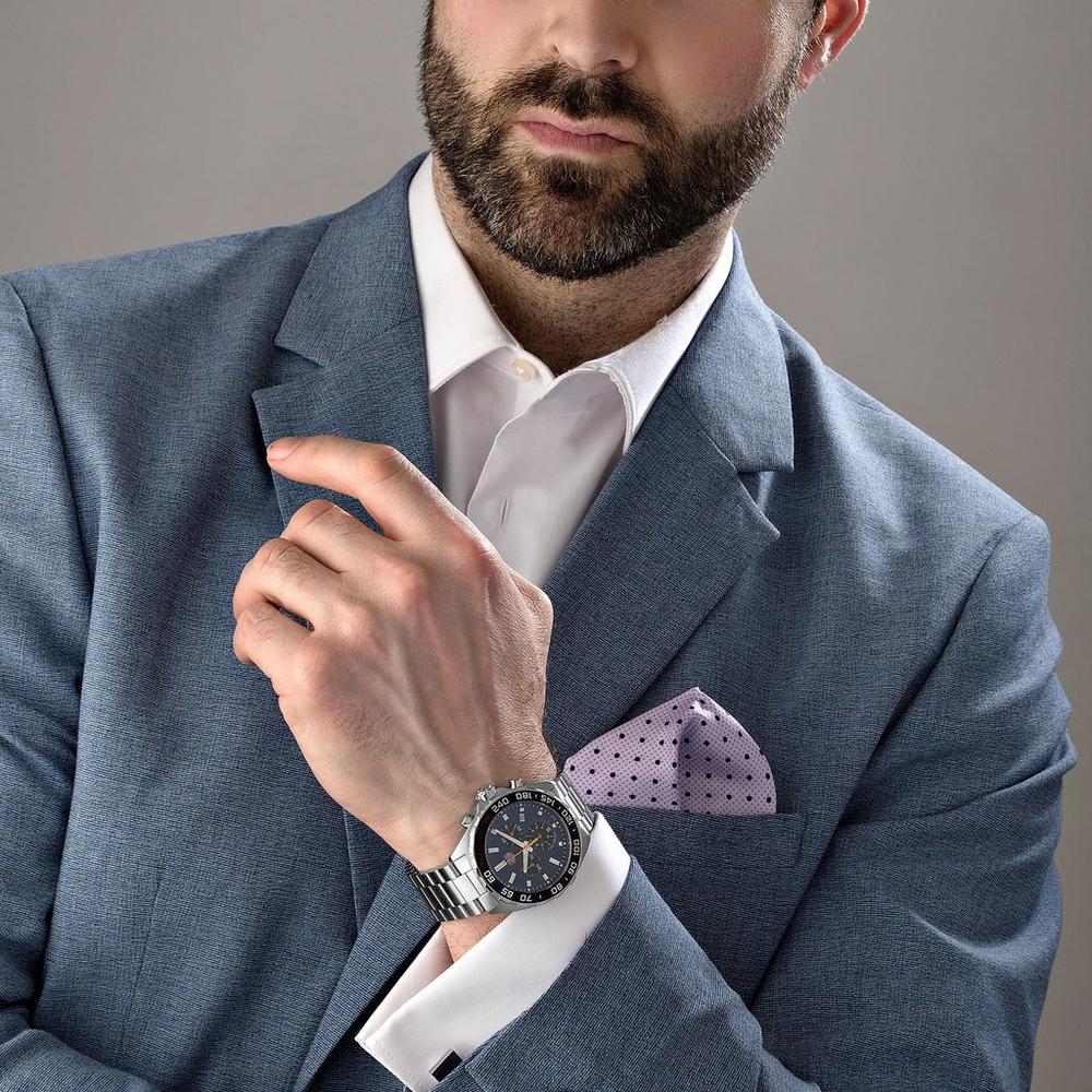 Full chronograph power at your fingertips with angled date and three easy-to-use sub-dials – permanent second indicator, hour and 1/10 second chronograph counter, and minute chronograph counter.