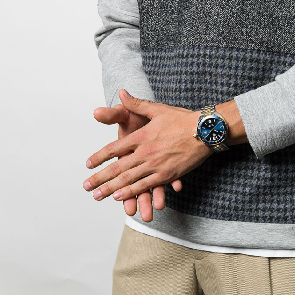 Stainless steel case with a two-tone (silver-tone and yellow gold-plated) stainless steel bracelet. Unidirectional rotating yellow gold-plated stainless steel with a blue top ring bezel. Navy blue dial with luminous yellow gold-tone hands and index hour markers. Arabic numerals mark the 6 and 12 o’clock positions. minute markers around the outer rim. Dial Type: Analog. Luminescent hands and markers.Swiss Made Tag Heuer Quartz Movement. Date.
