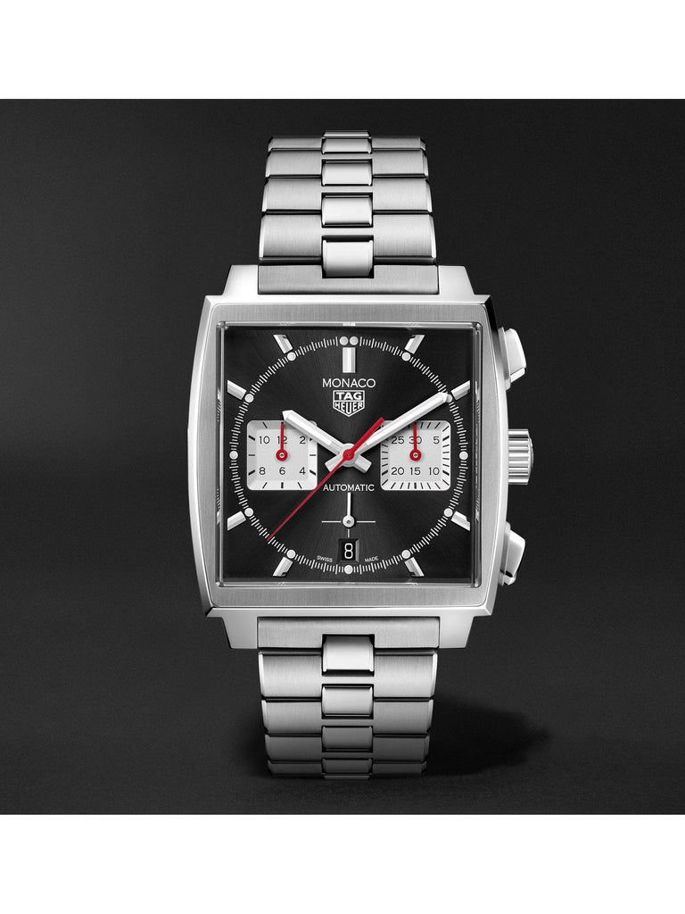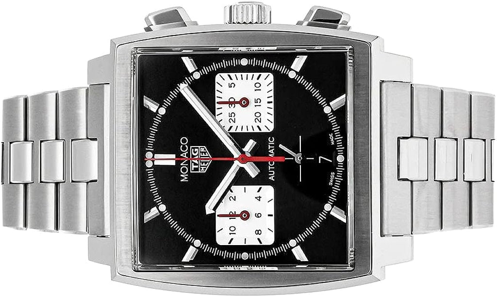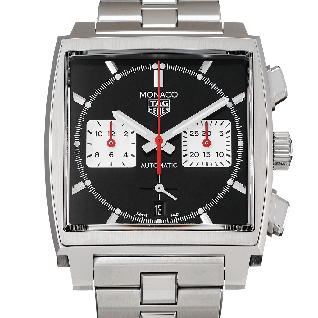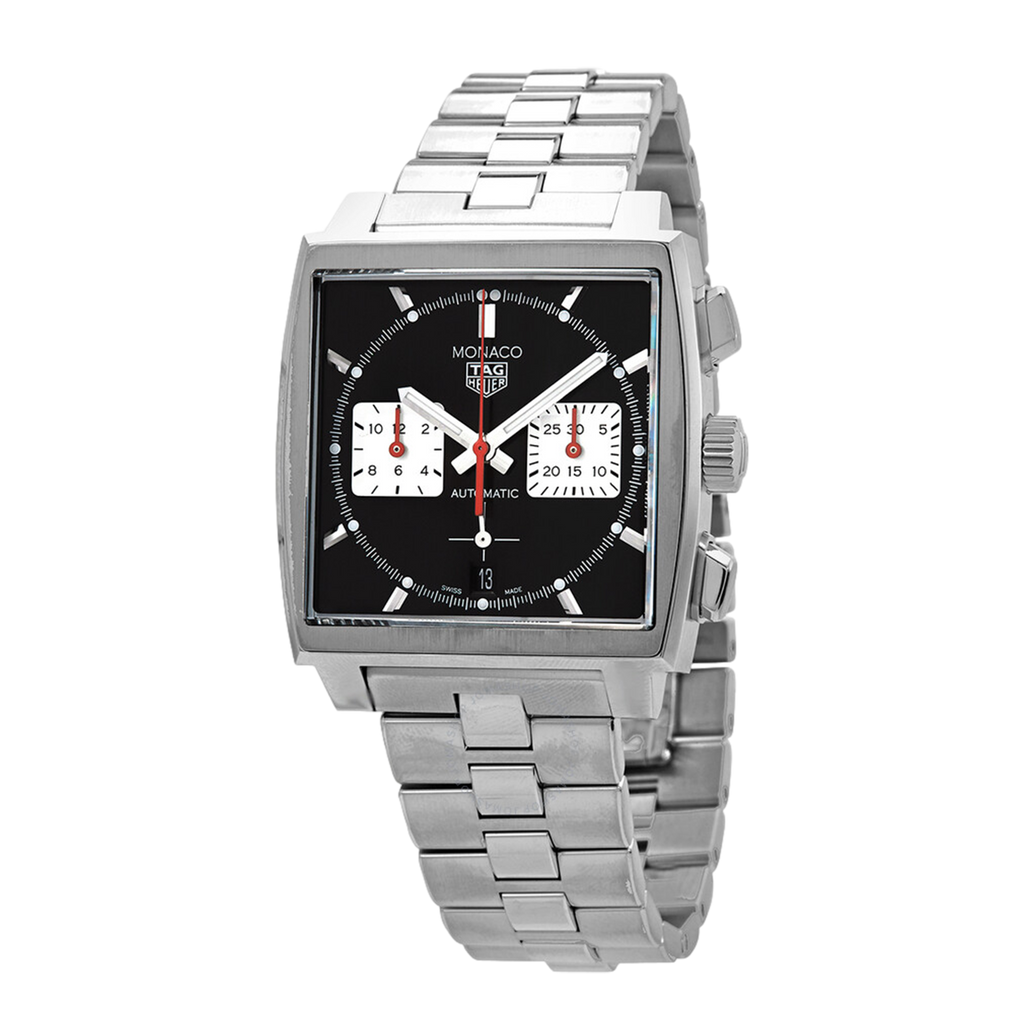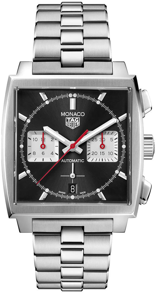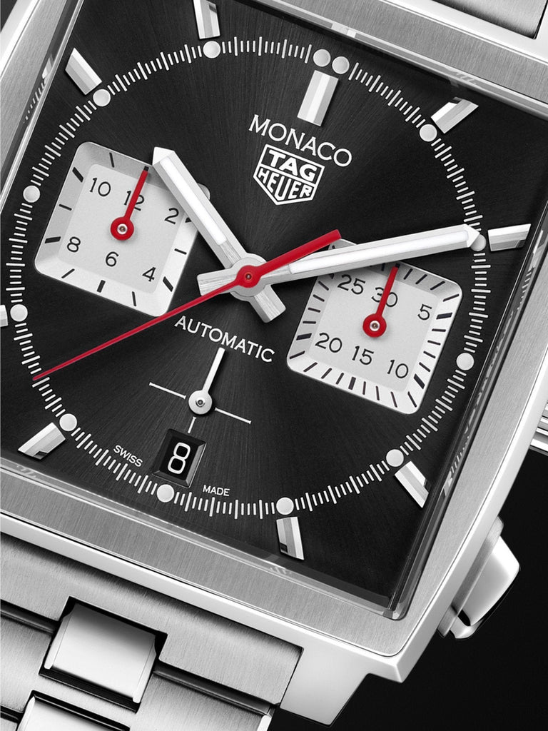 This Monaco chronograph is an elegant black sunray-brushed dial in a 39 mm square case, with red permanent seconds indicator. To celebrate our most famous icon, we revisit traditional colors of our Monaco Collection and also introduce our in-house manufactured movement Heuer 02.
