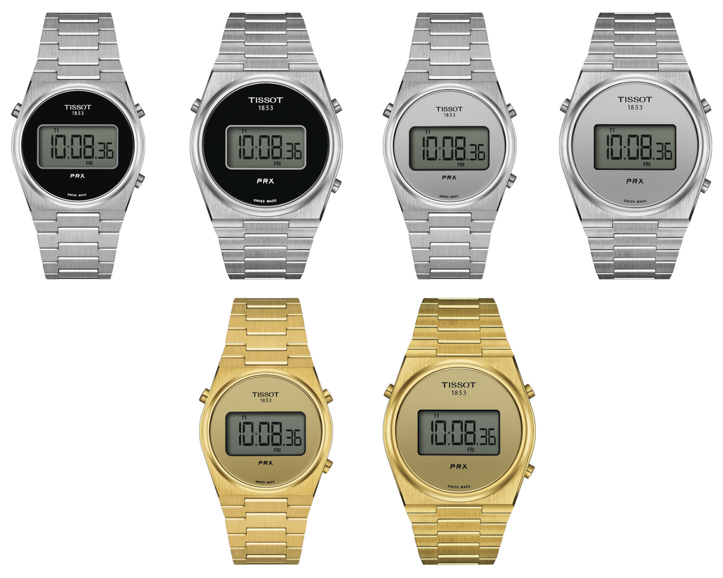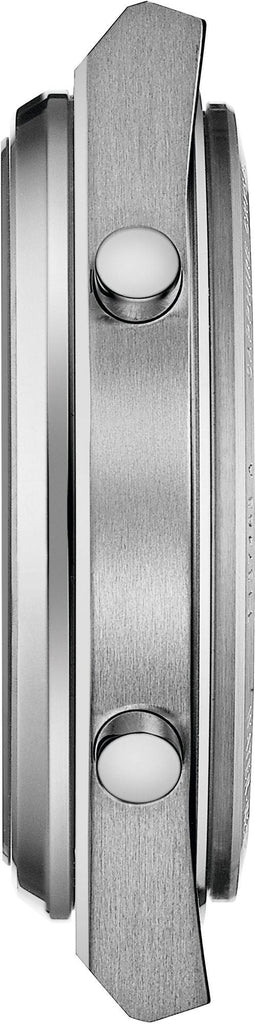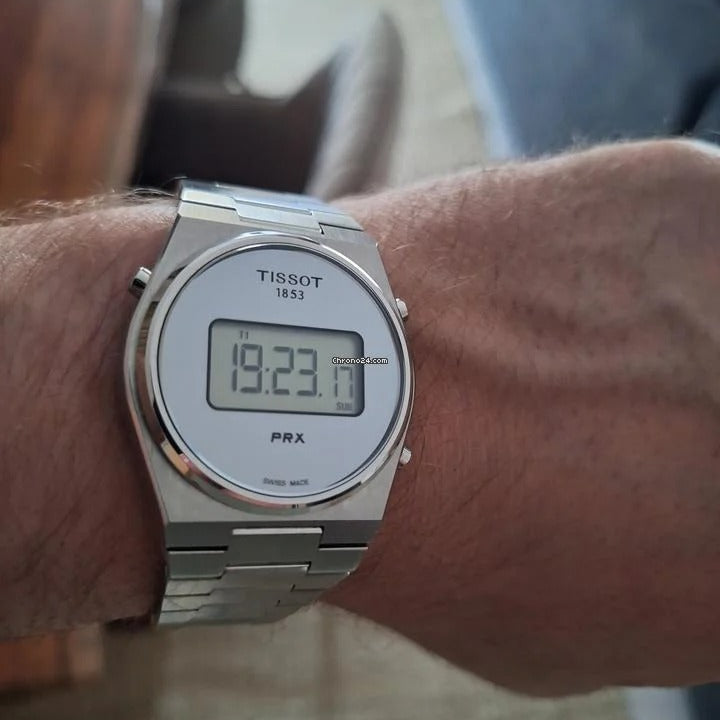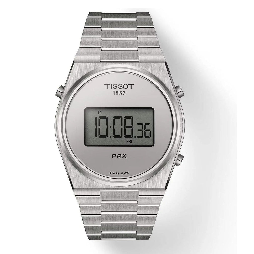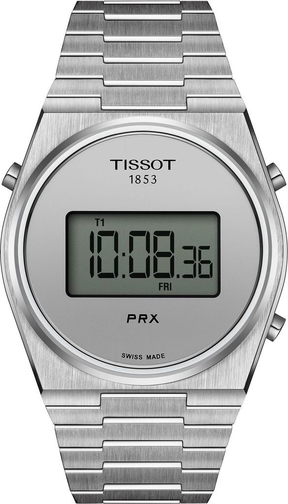 Brand New Authentic Tissot PRX Digital Silver Digital Dial Stainless Steel Men's Fashion Watch Model T137.463.11.030.00. Brushed Stainless Steel case with Brushed 316L Stainless Steel Bracelet watch band. Brushed Stainless Steel Deployment with Push Button clasp. Fixed bezel. Dial description: Digital Display on a Silver Mirror dial. Swiss Quartz movement. Powered by Calibre 4012 engine. Watch functions: Hour, Minute, Second, Day, Battery End Of Life Indicator. Push In crown. Scratch Resistant Sapphire crystal. Tonneau case shape. Case size: 40mm x 39.50mm. Case thickness: 10.90mm. Solid case back. 100 Meters - 330 Feet water resistant. 2-year warranty.
