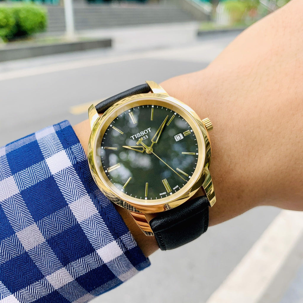 Brand New Authentic Tissot T-Classic Classic Dream Men's Watch Model T033.410.36.051.01. Stainless Steel with Gold Tone case with Black Leather strap. Tang clasp. Dial description: Yellow gold tone hands and index hour markers on a Black dial. Battery Operated Quartz movement. Powered by ETA 803.112 engine. Watch functions: Date, Hour, Minute, Second. Scratch Resistant Sapphire crystal. Case size: 38mm. Case thickness: 7.4mm. Solid case back. 30 Meters - 100 Feet water resistant. 2 year warranty. Also known as model: T0334103605101, T033-410-36-051-01.