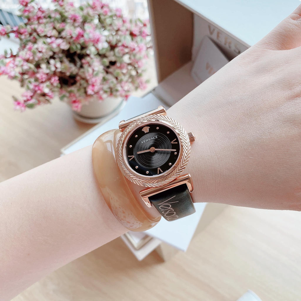 Versace V-Motif Vintage Logo Black Dial Black Leather Strap Watch for Women - VERE00818
